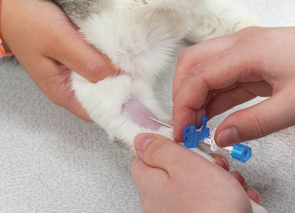 Veterinärmedizinischer Intravenöskatheter aus FEP mit biegsamen, beweglichen Flügeln; auf eine interne Nadel mit dreifach abgeschrägter Spitze montiert.