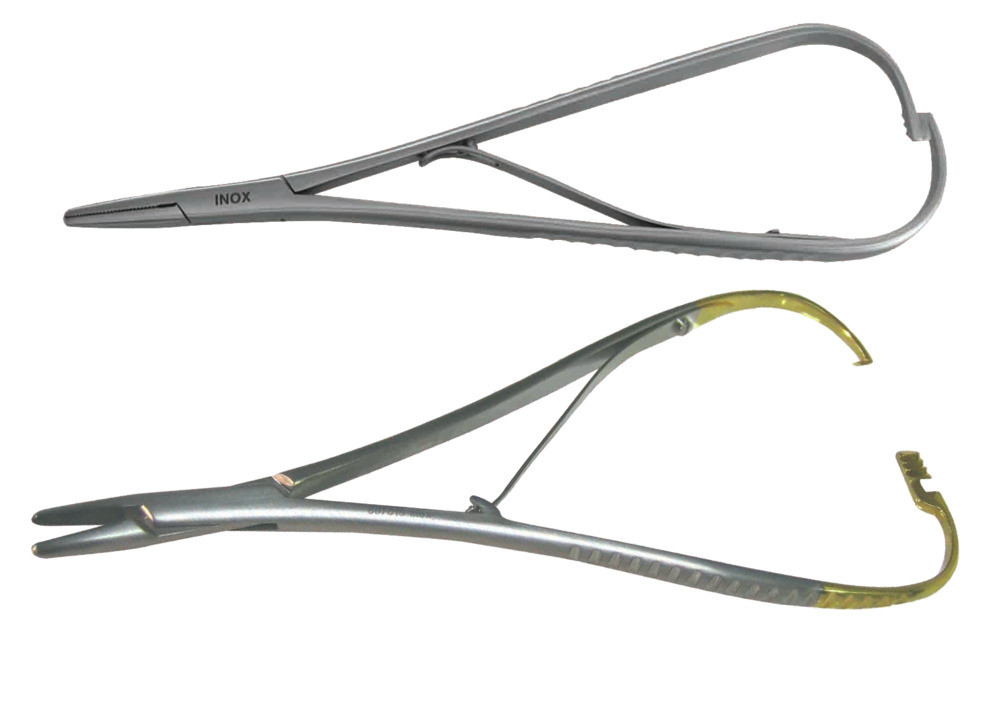 Nadelklemme aus matt satiniertem Edelstahl in chirurgischer Qualität.